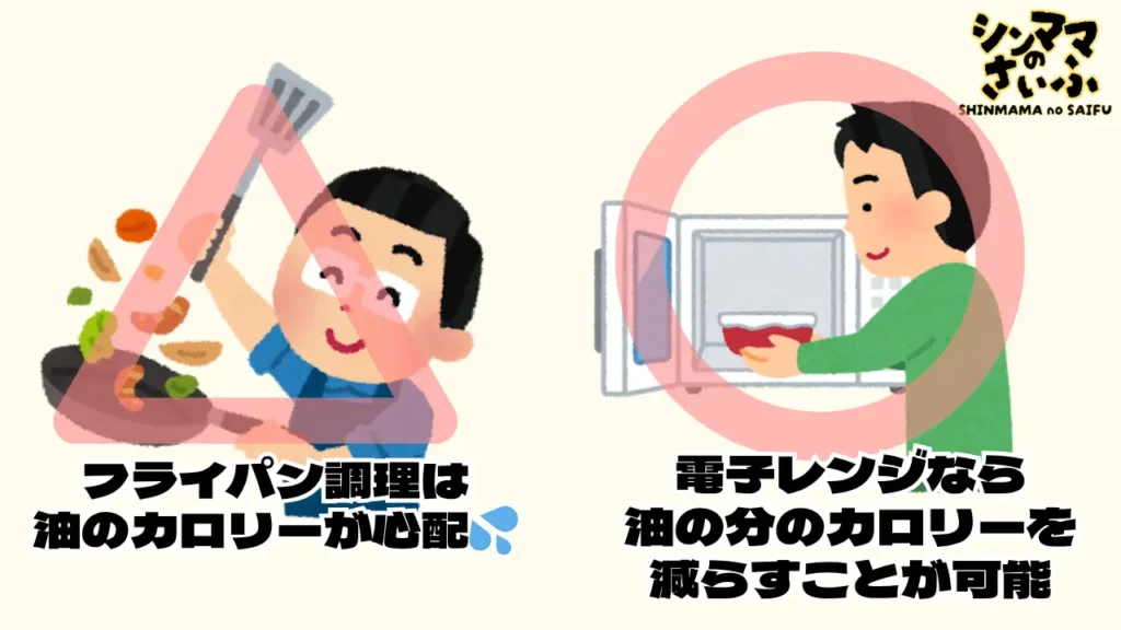 やはり、炒め物となると油を使うのでカロリーが一気に上昇。一般的な食油は大さじ1杯で126kcalもあります。なので、炒めるレシピでも電子レンジでの加熱調理に変えれるものは変えてみましょう。